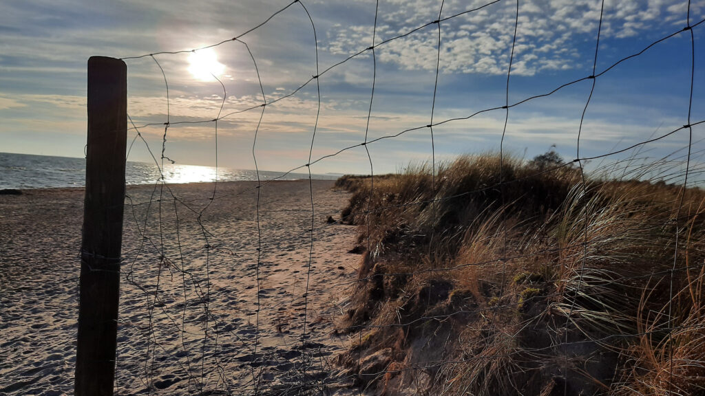 Als ich den Strand betrat, sah ich Mütter mit ihren Kindern spielen, Pärchen Hand in Hand und Leute mit ihren Hunden. Ich ging mit dem Blick direkt in die Sonne den Strand entlang. Die Leute verteilten sich sehr weitläufig und hielten auch Abstand zueinander. Die Meisten gingen direkt an der Wasserlinie entlang. Ich zog es vor mit Abstand zu allen durch den tieferen Strandsand zu laufen. Das war natürlich anstrengender für mich, aber naja… besser ist das. Die Sicht war klar und man konnte in der Ferne Lensterstrand und auch die Seebrücke von Grömitz erkennen. Das Wasser schlug mit kleinen Wellen und einem angenehmen und entspannten Rauschen an Land. Ich stapfte nach Luft japsend weiter, aber die ganze Atmosphäre war Balsam für mich und nirgends wäre ich in dem Moment lieber gewesen als dort in Klosterseestrand. Ich zückte meine Kamera, drehte Videos und fotografierte.