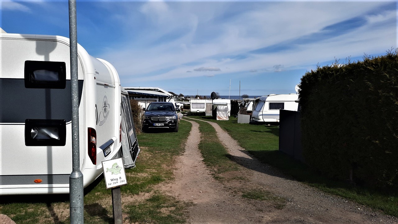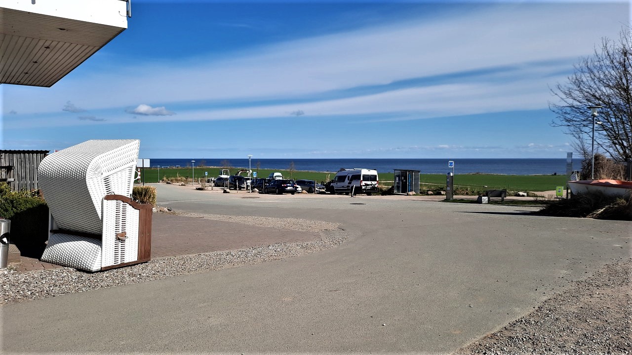 Separat vom Campingplatz und mit eigener Auffahrt versehen, liegt gleich nebenan der Wohnmobilpark Ostseeblick. Dieser befindet sich am Rand eines großen Feldes mit einem herrlichen Blick auf die Ostsee. Kommt man mit dem Wohnmobil dort an, sucht man sich einen Stellplatz und parkt sein Wohnmobil mit der Fahrerkabine Richtung Ostsee gerichtet. Vor dem Gelände neben dem Besucherparkplatz befindet sich ein Check in/ Check out Terminal. Dort kann man per Kartenzahlung einchecken.